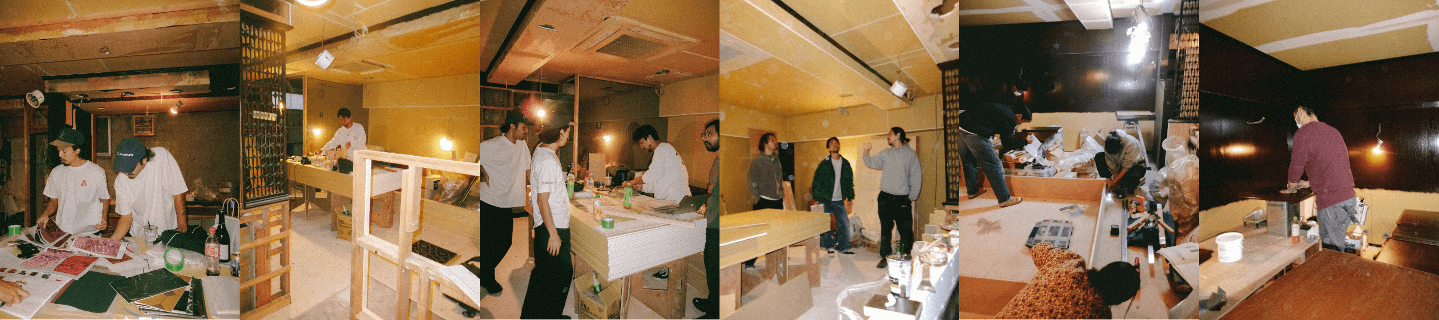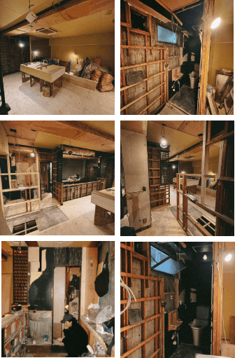 多くのお客さまから「よく居抜きでこのような店舗がありましたね」とお声かけいただきますが、わたしたちの店舗「心酔」は、当初あった内装の9割を解体し、ほぼスケルトン状態から造作でこれらの内装を創り上げています。懐かしみを感じる壁、ソファー、カウンター、什器など、皆さまの力をお借りしながら私たちの想いと共にすべて新設したもの。その制作過程を少しばかり記録しておりましたので、我々の思い出として、またアーカイブとして、ここに掲載いたします。