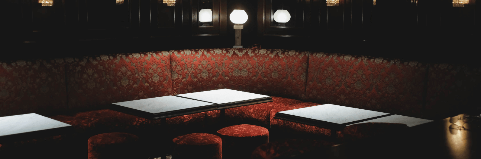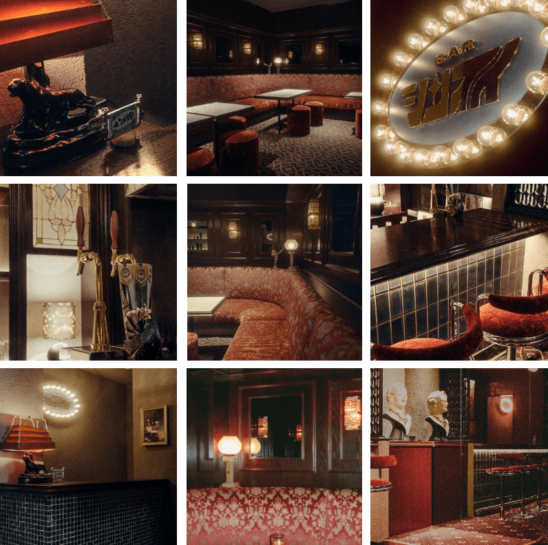 昭和バブルの全盛期に栄えた純喫茶、スナック、キャバレーの文化にフィーチャーし、全体として懐かしみのある空間を再現しながらも、現代におけるモダンなディテールを取り入れ、ただレトロにとどまらない新旧の共存を目指しました。昭和時代の内装は、建材や内装の見せ方は贅沢なものが象徴的だったものの、各部の納まりや細かな備品については昨今の新規店舗のように繊細な扱いがされていないことも多く、ある意味その混沌としていて大胆なディテールも含めてバブルの価値感だったように思われます。