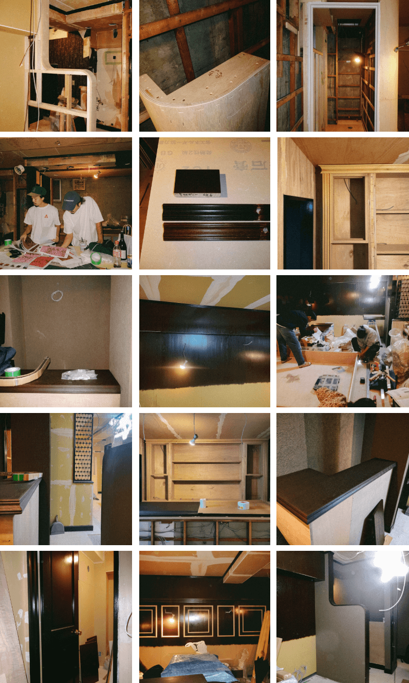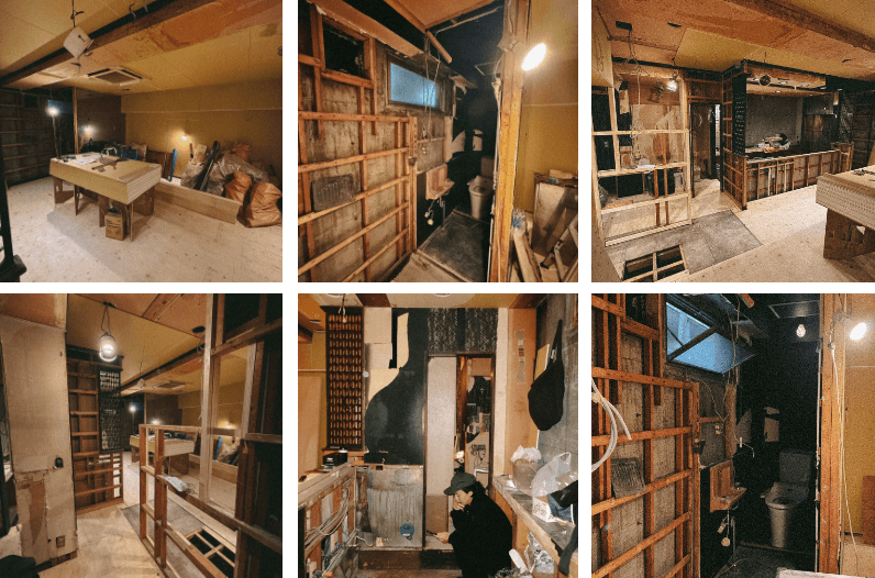 多くのお客さまから「よく居抜きでこのような店舗がありましたね」とお声かけいただきますが、わたしたちの店舗「心酔」は、当初あった内装の9割を解体し、ほぼスケルトン状態から造作でこれらの内装を創り上げています。懐かしみを感じる壁、ソファー、カウンター、什器など、皆さまの力をお借りしながら私たちの想いと共にすべて新設したもの。その制作過程を少しばかり記録しておりましたので、我々の思い出として、またアーカイブとして、ここに掲載いたします。